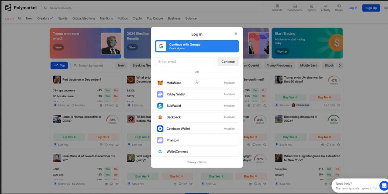 - 크롬 브라우저에서 https://polymarket.com 접속
