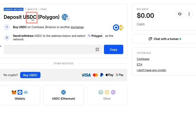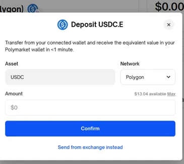 - USDC 충전: 폴리곤 네트워크 기반의 USDC를 구매하여 지갑으로 전송
