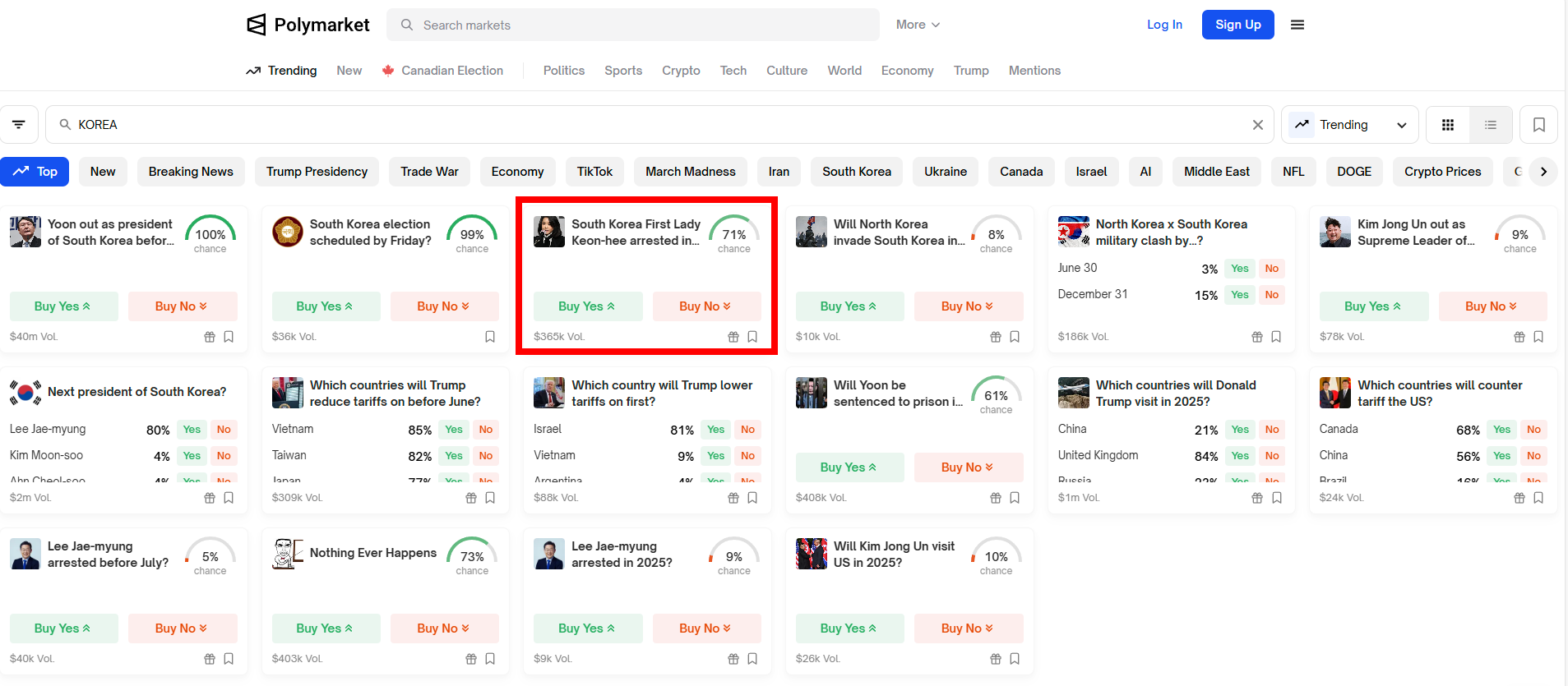 - 예측 시장 탐색: 다양한 주제의 예측시장 확인 (예: “2025년 내 김건희가 구속될까?”)