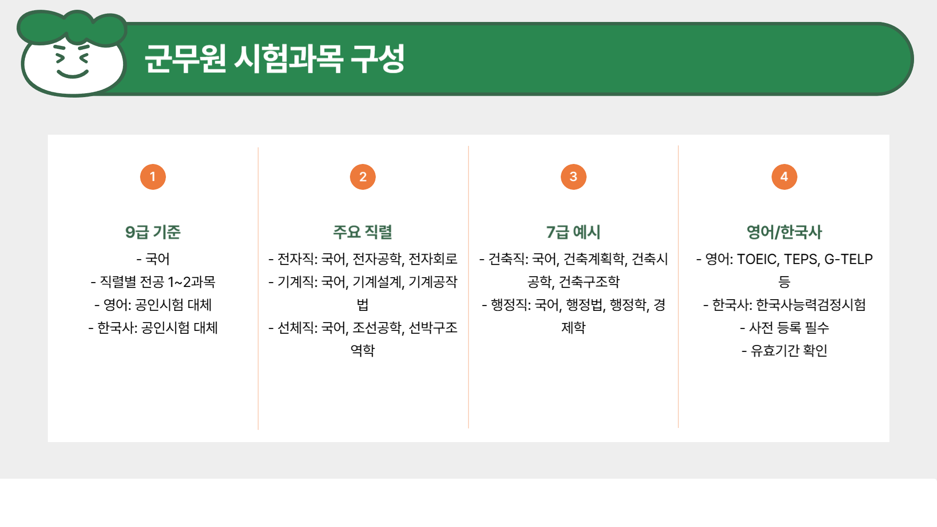 9급 군무원 공채는 국어와 직렬별 전공 1~2과목으로 필기시험을 치르게 되며, 영어와 한국사는 공인시험(예: TOEIC, G-TELP, 한국사능력검정시험 등)으로 대체됩니다.