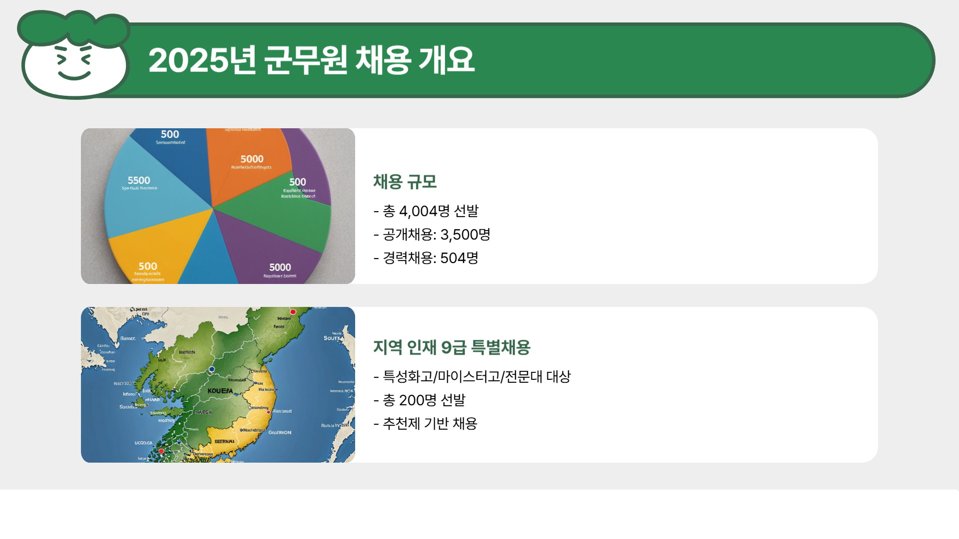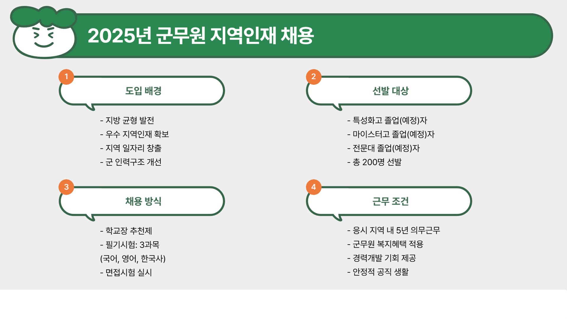 2025년부터는 지역 인재 9급 특별채용 제도가 도입되어, 특성화고·마이스터고·전문대 졸업(예정)자를 대상으로 총 200명의 군무원을 선발합니다.