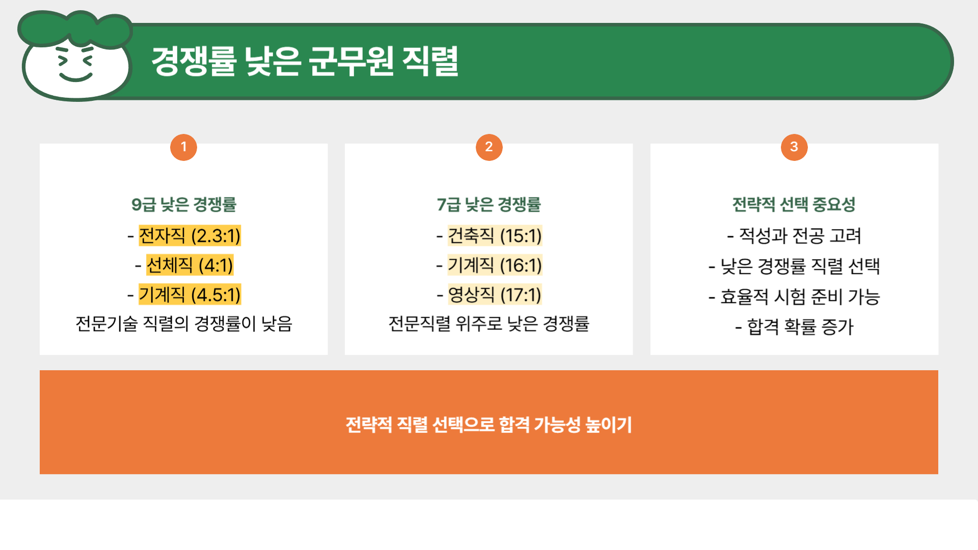 전공과 적성에 따라 낮은 경쟁률 직렬을 선택하면 보다 효율적인 시험 준비가 가능합니다.