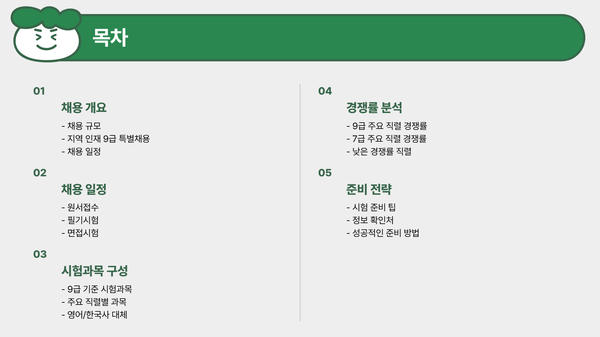 군무원 2025 채용은 규모 확대와 시험제도 변화로 수험생에게 새로운 기회가 될 것입니다. 시험일정과 시험과목을 철저히 확인하고, 경쟁률 낮은 직렬까지 전략적으로 접근한다면, 여러분도 충분히 군무원 합격에 도달할 수 있습니다.