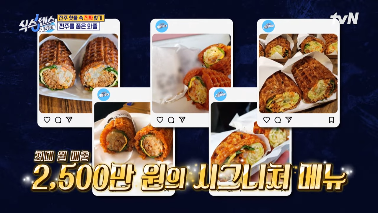 비빔밥에 제육볶음, 깻잎, 들깨 양배추 피클 등 각종 재료가 와플 틀 안에서 조화를 이룹니다. 겉은 바삭하고 속은 따뜻한 이 메뉴는 식스센스 방송 이후 와플 SNS를 통해 급격히 언급되며 전주 대표 이색 메뉴로 떠올랐습니다.