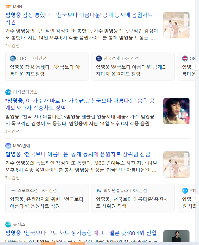 임영웅의 천국보다 아름다운은 공개 직후 음원 사이트에서 급상승을 기록하며 멜론 HOT 100에서 1위를 차지했고, 유튜브 뮤직비디오는 단 하루 만에 100만 뷰를 돌파했습니다. 팬들은 “가슴이 저릿하다”, “또 하나의 인생곡”이라며 임영웅의 OST 활동에 큰 감동을 표하고 있습니다.
