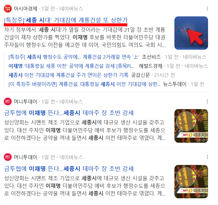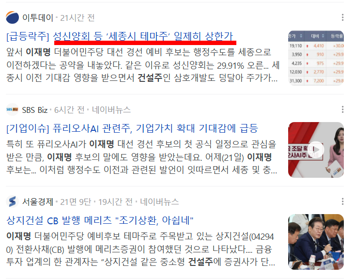 이재명 관련주 세종시 이전(상지·계룡·동신건설·삼호개발·대주산업·성신양회 주가)