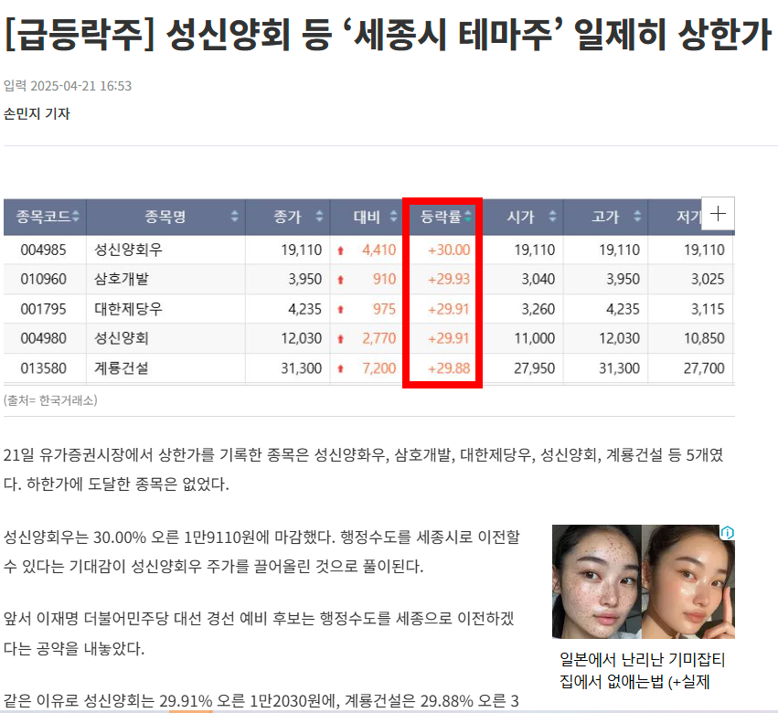 - 상지건설, 계룡건설, 동신건설, 삼호개발, 대주산업, 성신양회 등 세종시 관련주 급등