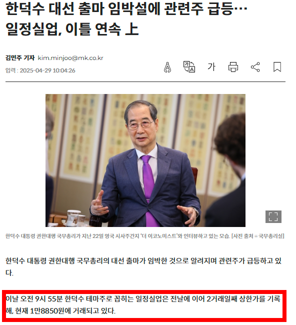 한덕수 관련주 중에서도 특히 민감하게 주가가 반응하며, 대선 관련 이슈 발생 시 강력한 급등세를 보이는 특징이 있습니다.