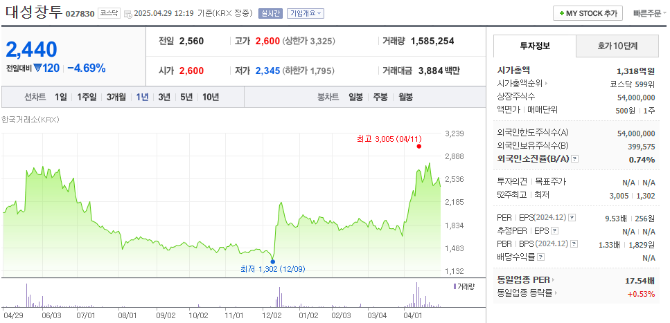 대성창투(027830)는 한덕수 총리와 학연(경기고-서울대-하버드대)이 연결된 관련주입니다. 벤처 투자업 특성상 테마 외에도 실적 모멘텀을 기대할 수 있습니다.
