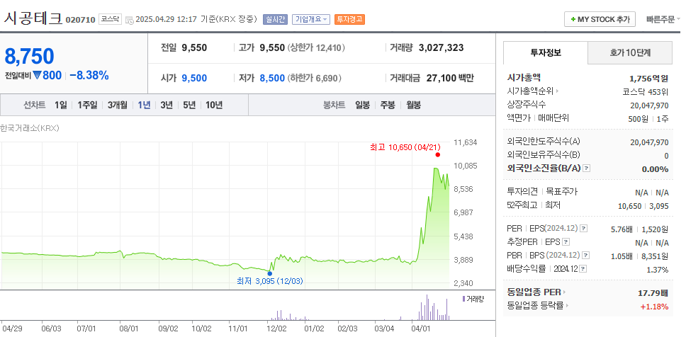 시공테크(020710)는 한덕수 총리와 과거 국민경제자문회의 민간위원으로 함께 활동한 인연으로 관련주 대장주로 꼽힙니다.