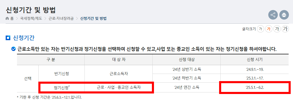 - 정기 신청: 연 1회, 근로·사업소득자 모두 대상