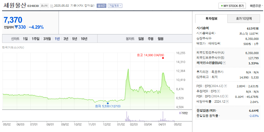 🔗 네이버 금융 – 세원물산 - 최근 급등률: 약 +21% (2025년 5월 초 기준)