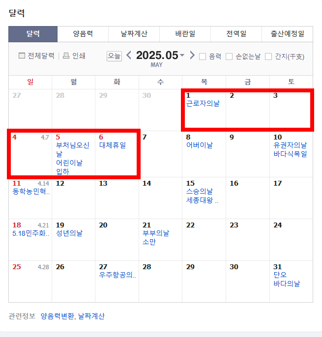- 5월 2일(금): 임시공휴일 (지정 시)