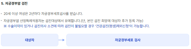 자궁경부암 | 만 20세 이상 여성 | 2년 | 자궁경부 세포검사 |
