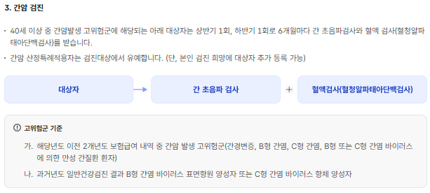 간암 | 만 40세 이상 (고위험군) | 6개월 | 간 초음파 및 혈액검사 |